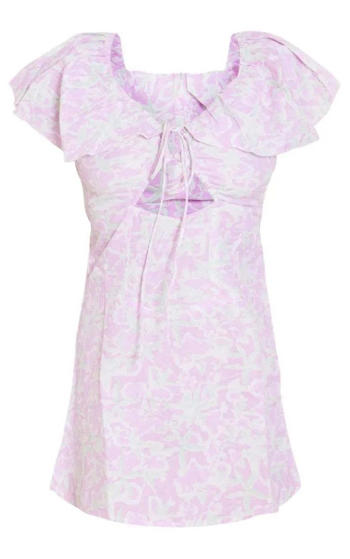 Channel all the chic vibes into your new season wardrobe with this lilac abstract floral print frill sleeve tie shift dress, is it the perfect piece to take your look effortlessly from day to night. Made with a lilac abstract floral print material with frill sleeves and a tie front design, how could you resist ? Pair this shift dress with platform sandals and hoop earrings for a combo we’re crushing on.