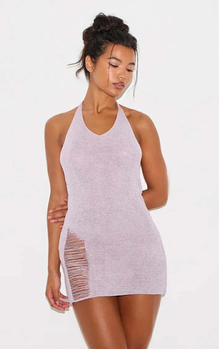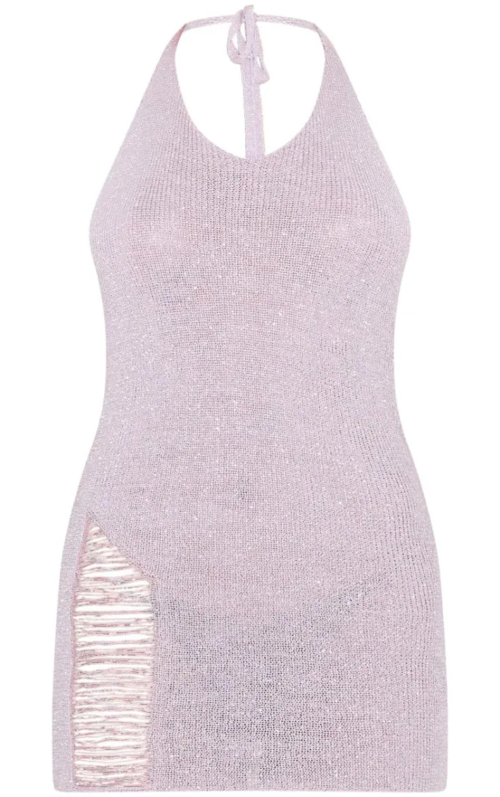 Elevate your evening wardrobe with this lilac glitter knit distressed ladder halterneck mini dress. Brought to you in a lilac hue glitter knit material with a distressed ladder detail and halter neckline, this mini dress is a must have. How can you resist? Style with statement heels and chic accessories to own the night.