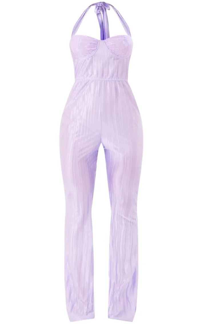 Switch out your staple occasion dress for this unreal lilac plisse cut underwired halter tie jumpsuit. Brought to you in a dreamy lilac hue plisse material that is sure to make you stand out from the crowd and featuring a flattering underwired cup with lace detailing for that extra touch of luxe, we are obsessed. With a figure-worshipping fit and halter tie detailing, you really can’t go wrong. Just add your highest heels and statement accessories to bring the look together.