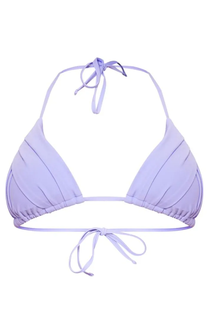 Stand out from the crowd with this lilac seam detail padded triangle bikini top and be sure to gain all the compliments. Brought to you in a lilac hue material with seam detail and a padded design, what more could you ask for? If you’re vacay shopping then this bikini top will be the first piece you add to you basket. Style with the matching bikini bottoms, gold accessories and a baseball cap for a look that everyone will want.
