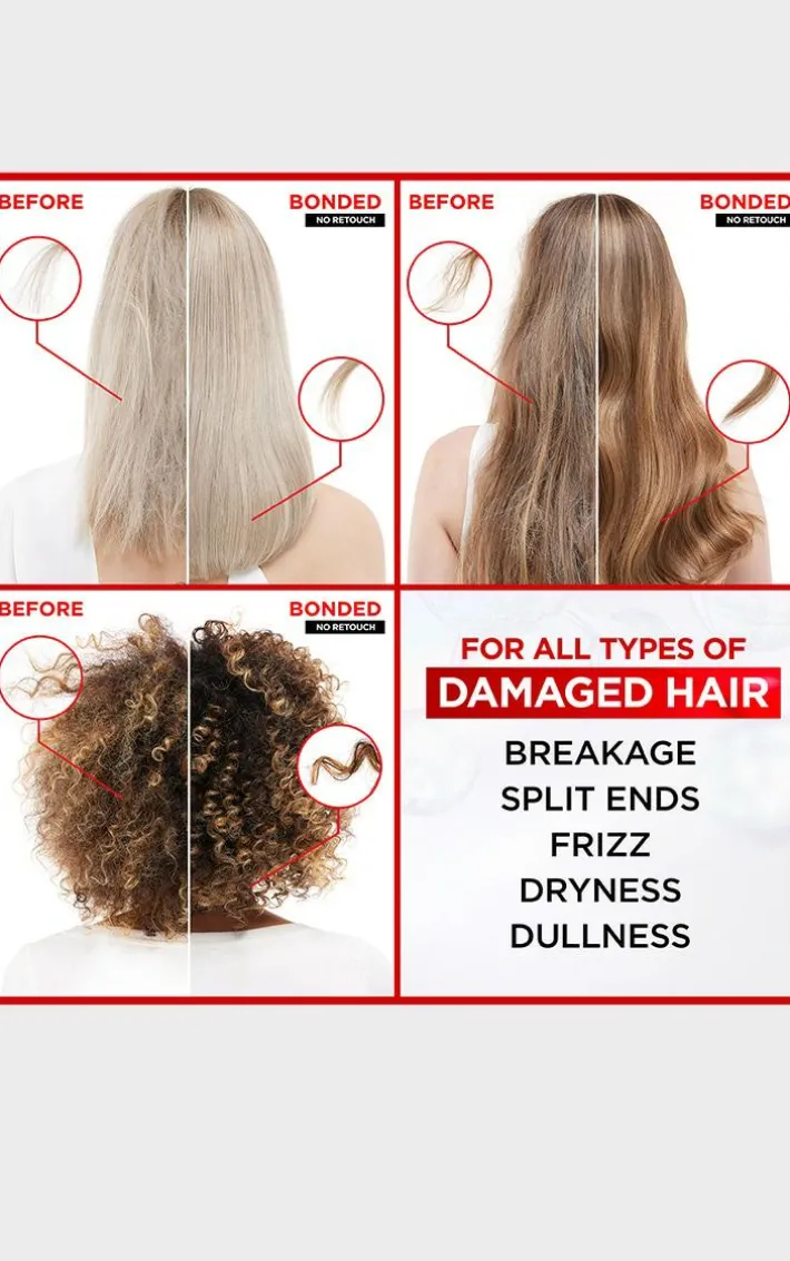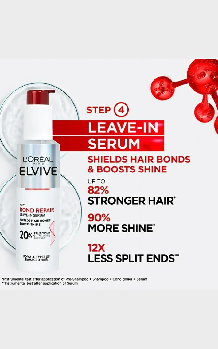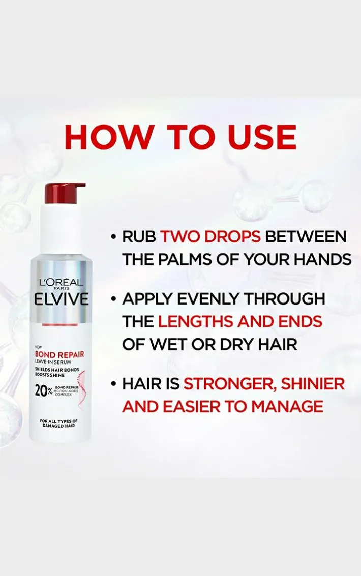 This leave-in serum forms the fourth and final step in the new Bond Repair haircare routine for stronger hair with maximum shine and heat protection. Hair is made up of millions of bonds that give it structure and strength. When hair bonds break, through brushing, bleaching, heating, and styling, hair becomes weak and damaged. For the first time, the L’Oréal formula powered by Citric Acid Complex targets damaged hair. Up to 12x less split-ends¹, 98% stronger hair² & 82% more shine². Suitable for all types of damaged hair.