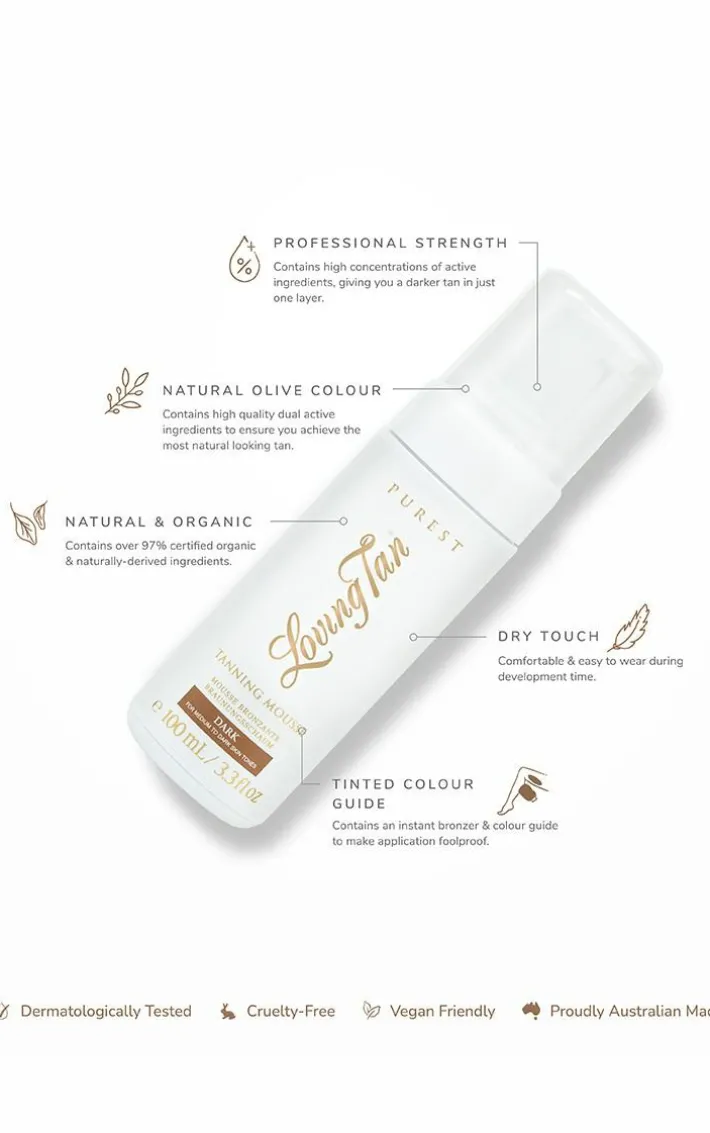 Purest Tanning Mousse is formulated using over 97% certified organic and naturally derived ingredients to provide you with a natural-looking tan within minutes. Infused with Cocoa, Papaya and Pomegranate extracts, this nourishing formula rejuvenates your skin while your tan develops. It is both quick-drying and delicately fragrant.