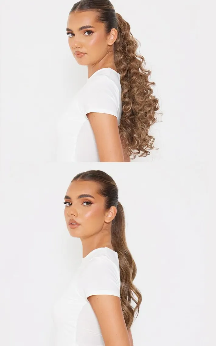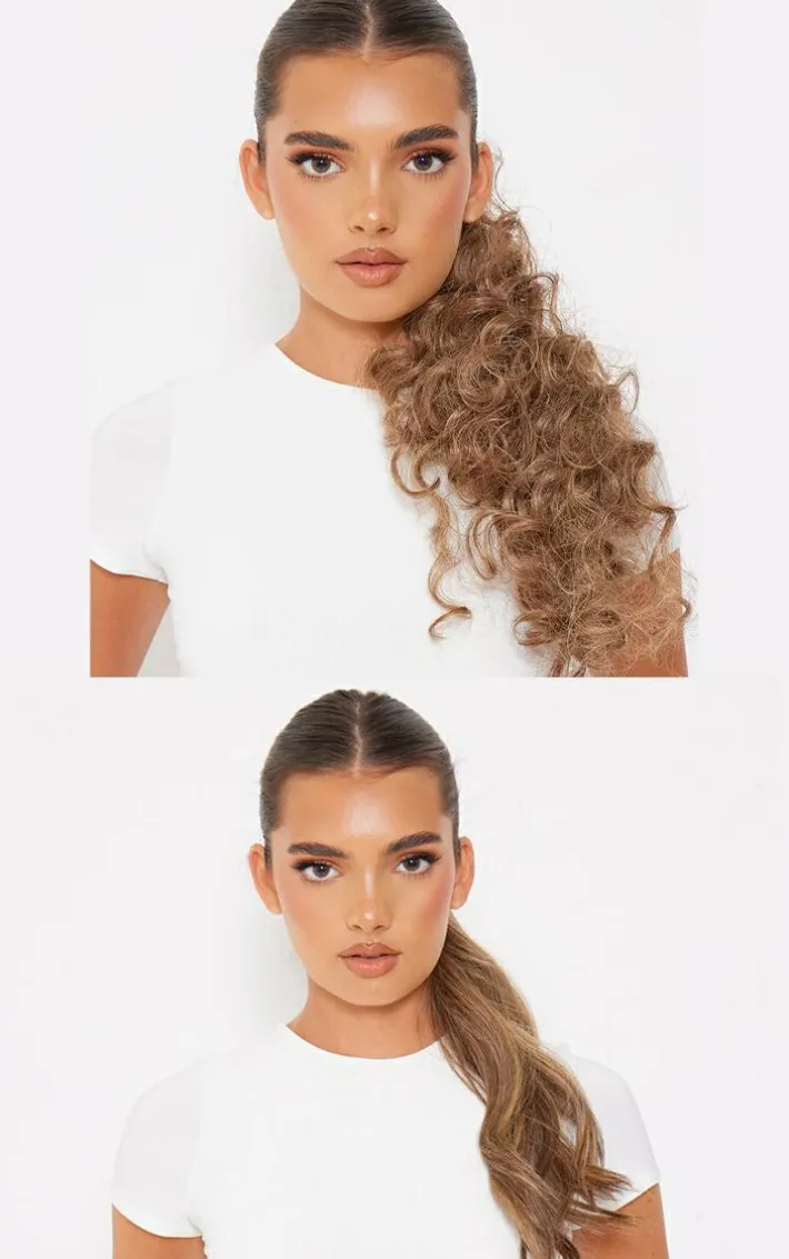 Attach the hairpiece by gripping it under your bobble with the built-in comb; this can then be securely fitted by wrapping the velcro/hair around your own pony to ensure a seamless application.
