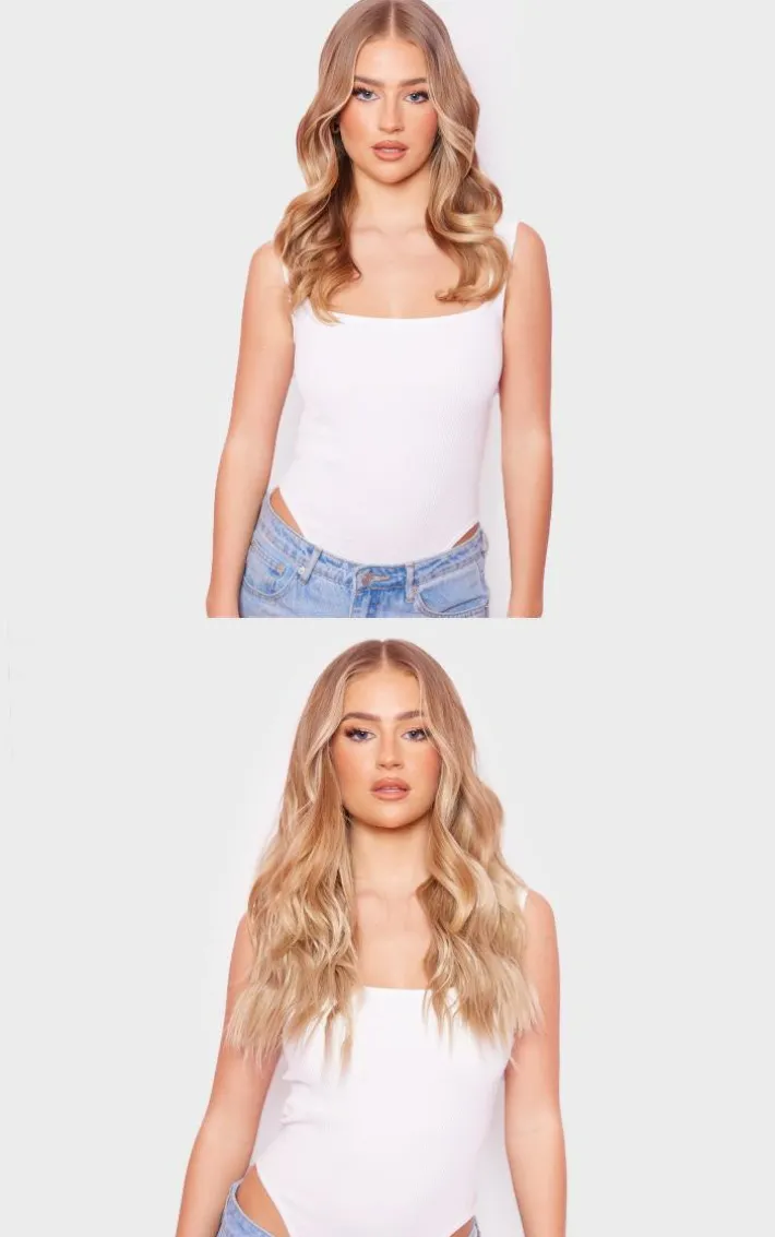 Clip the 3 wider pieces in at the back of your hair to add thickness and clip the 2 narrow pieces in at the side to frame your face and provide all over length and volume.