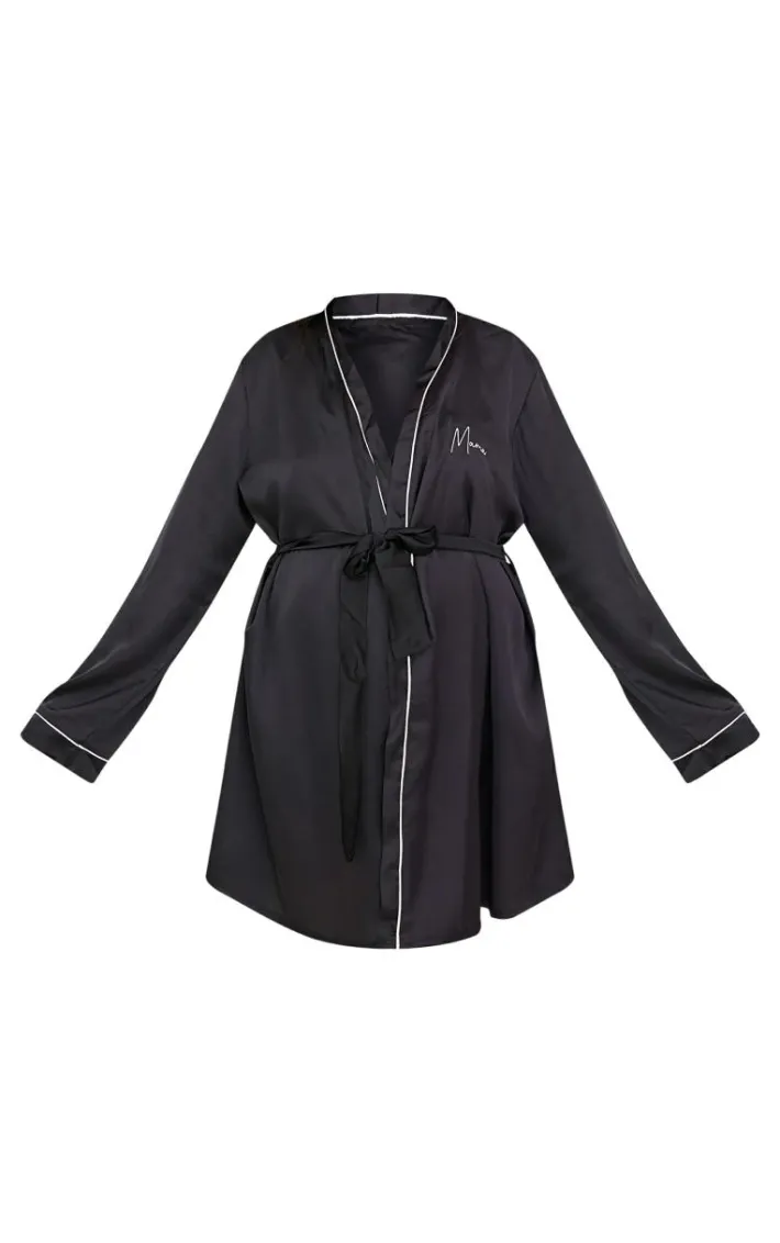 Make this maternity black embroidered Mama satin tie waist robe a staple in your pajama collection. Brought to you in a black satin material with an embroidered ‘Mama’ design and a tie waist fastening, how can you resist? Layer this black robe over the matching pajama set and just add fluffy slippers for the perfect night in outfit.