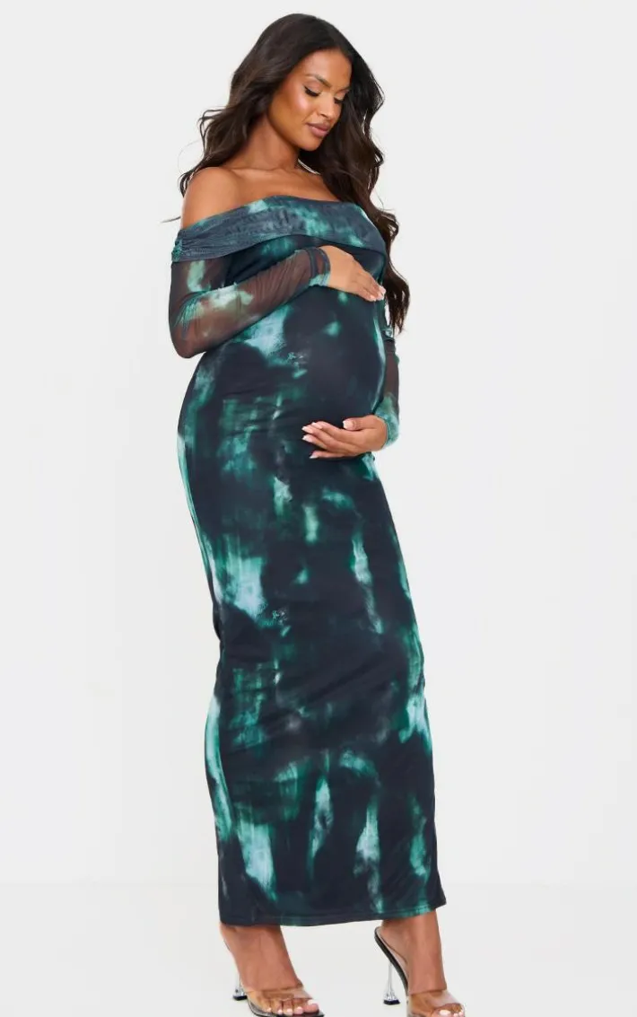 Your what to wear dilemmas are solved with this maternity black printed mesh bardot long sleeve maxi dress. Its black printed mesh fabric, bardot neckline and maxi dress length are made for your next big event. Work your styling technique and add a pair of clear toe heels and silver jewelry to finish the look.