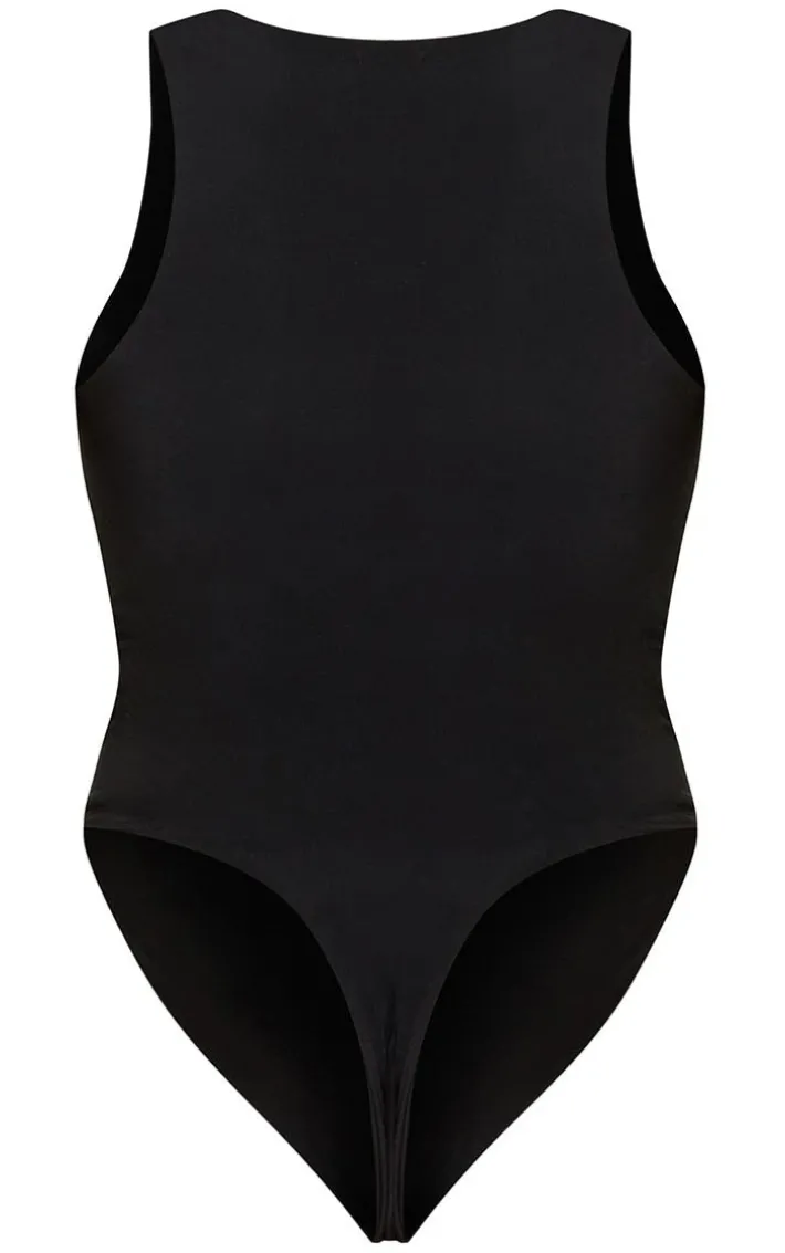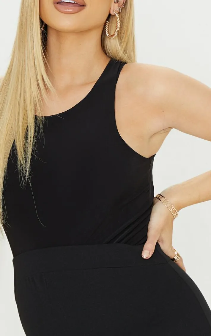 Add this bodysuit to your weekend wardrobe. Featuring a black slinky material with a racer neckline and a sleeveless design, what’s not to love? Wear with comfy black bottoms, your fave accessories and printed slides for a look we are obsessed with.
