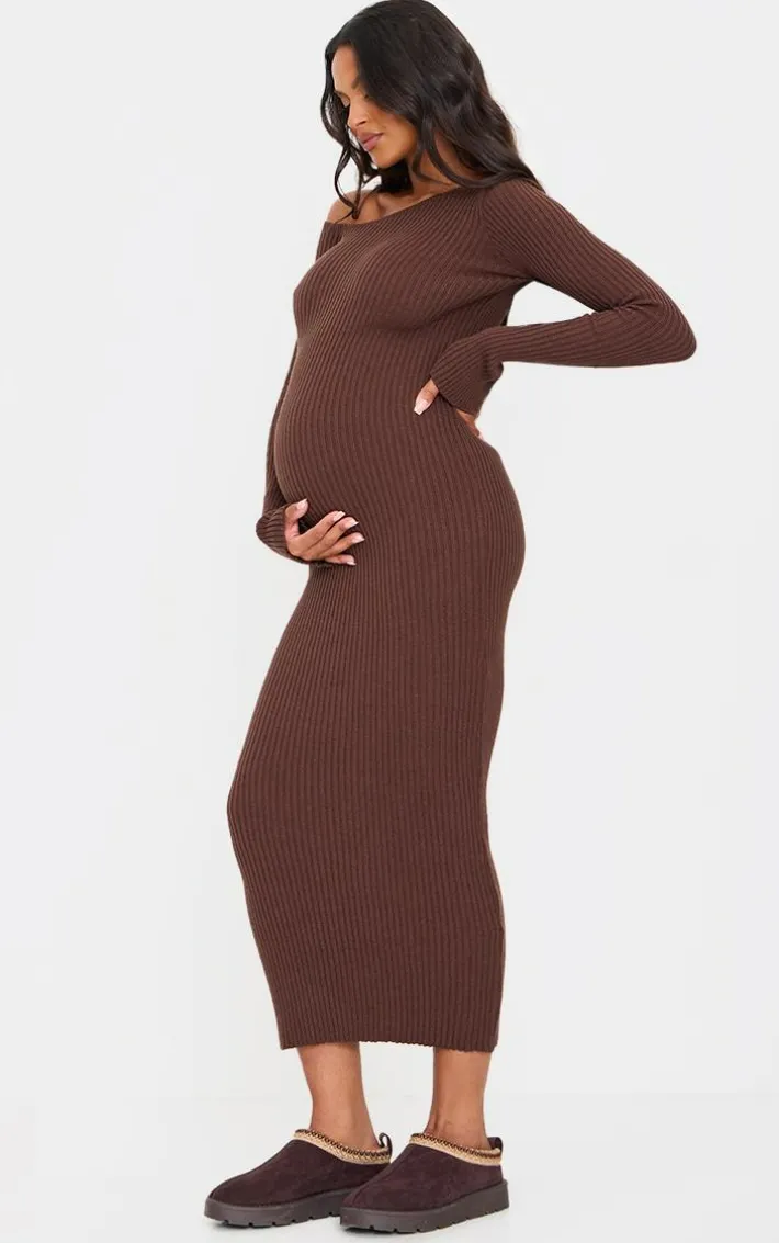 Work your styling techniques to make this maternity chocolate asymmetric long sleeve rib knit maxi dress perfect for any occasion. Brought to you in a chocolate hue rib knit material with an asymmetric design, long sleeves and a bump-hugging maxi fit, you really can’t go wrong. Style this maxi dress with comfy shoes and simple gold accessories for an everyday look like no other.