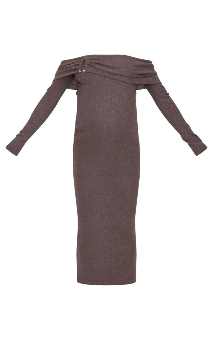 Make weekend styling look effortless with this maternity chocolate heavy brushed rib bardot trim midaxi dress. Brought to you in a chocolate heavy brushed rib material with a bardot neckline, trim detailing and a bump-hugging midaxi fit, how can you resist? Style this maxi dress with heels and gold accessories to elevate the look.