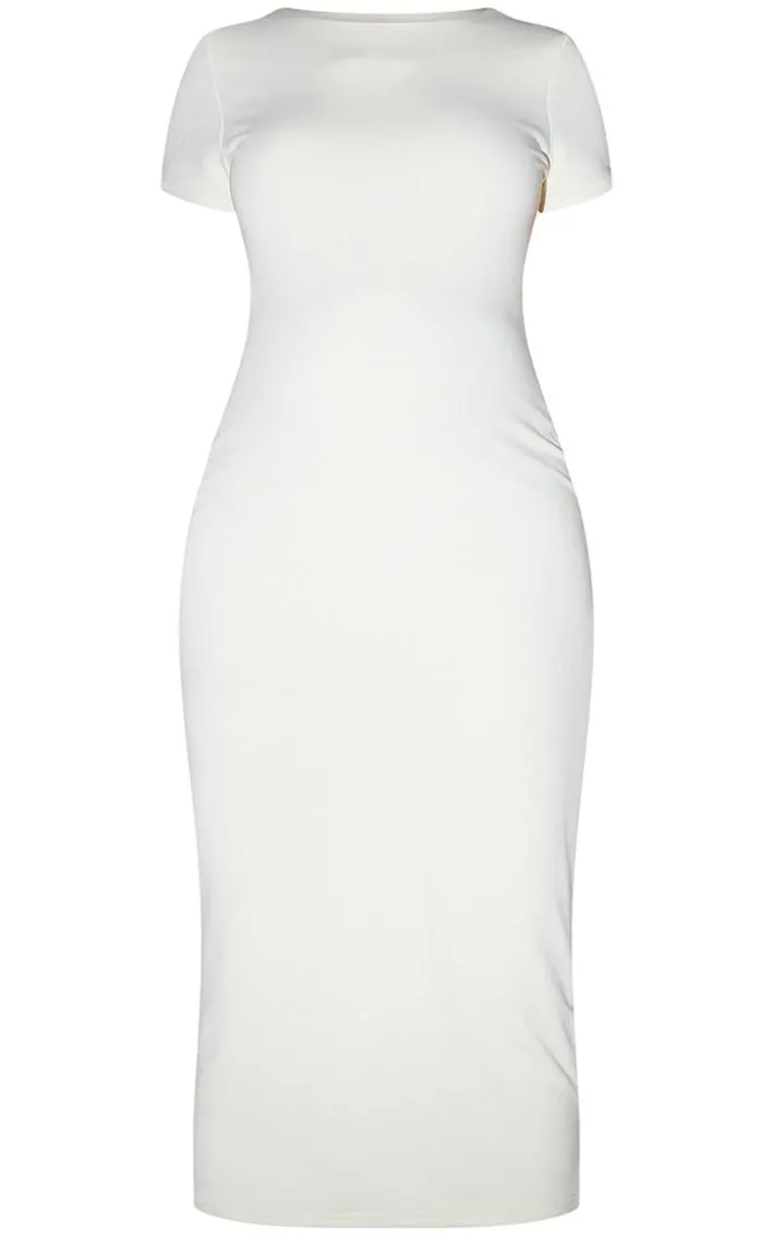 Get ready to look all kinds of glam in this dress. Featuring a cream jersey material with a contour fit and short sleeves. Pair with strappy heels and a mini bag for a date.