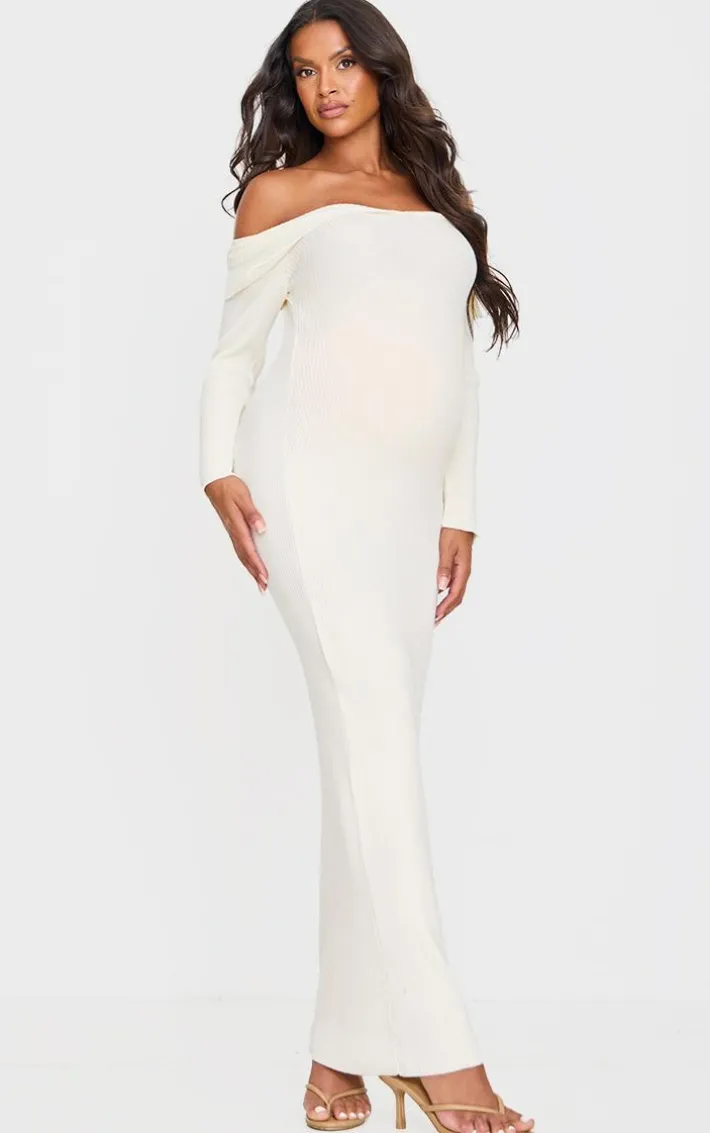 Look and feel your most confident in this maternity cream off the shoulder rib knit maxi dress. Brought to you in a must have cream hue, with an off the shoulder design and cosy rib knit material, how can you say no? Simply style with a pair of nude heels and simple accessories to finish off the look.
