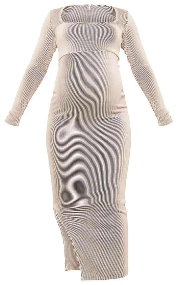 This maxi dress is perfect for showing off your bump. Featuring a cream ribbed material with long sleeves and a side split. Team with a simple chain, clear heels and a mini bag to finish.