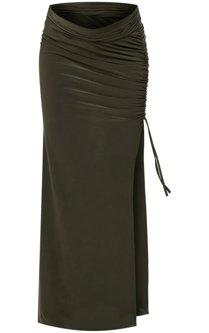 We’re totally in love with this maternity dark khaki slinky ruched detail maxi skirt for your new season wardrobe and beyond. Perfect for dressing up for the weekend or down for an everyday vibe, this maternity maxi skirt is a yes from us. With a dark khaki slinky material, ruched detailing and a split hem, how could you not be in love? Team with a basic top, clear heels and gold accessories for a look like no other.