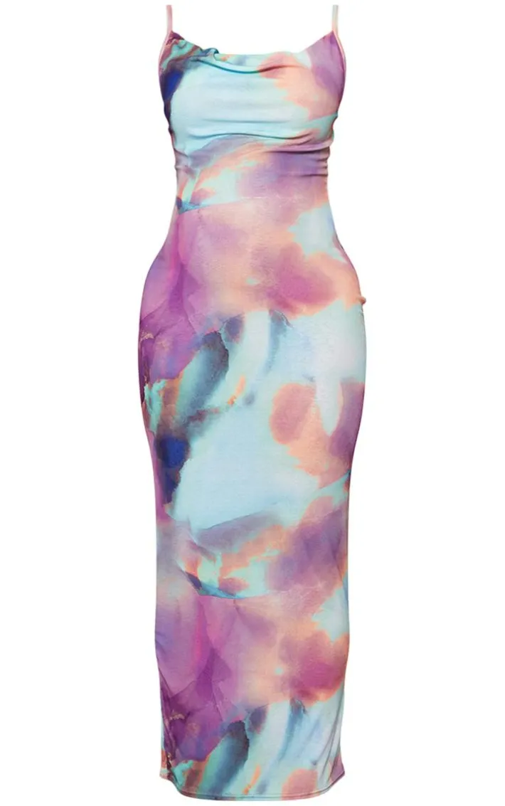 Give your new season wardrobe a glam upgrade with this maternity purple watercolour print cowl maxi dress, you’re sure to be turning heads at your next special occasion. It features a purple watercolour print material with a cowl neck design and a figure-flattering fit, we’re seriously in love. Team this maternity maxi dress with clear slip-on heels and statement accessories for a look everyone will want.