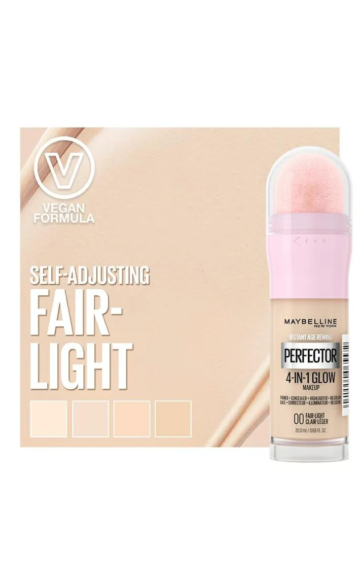 Meet Maybelline New York’s 1st 4-in-1 makeup for a perfected glow look. Instant Perfector Glow gives skin the benefit of four products in one. Get the look of primer, concealer, highlighter and BB cream—all in one easy step. It’s an illuminating formula that primes, conceals, highlights, and evens skin tone with light coverage. This do-it-all makeup has everything you need to perfect your look in an instant! Available in 5 self-adjusting shades.