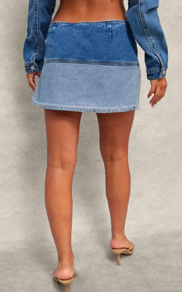 Hit refresh on your two piece sets game with this mid blue wash contrast panel button detail denim mini skirt. Brought to you in a mid blue wash denim material with a contrast panel design and button detail, this mini skirt is calling your name. Style with the matching denim jacket, nude heels and gold accessories to turn heads for all the right reasons.