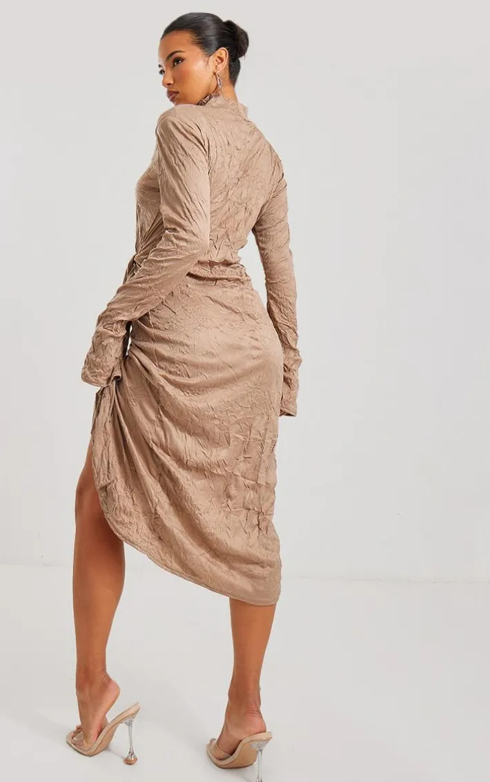 Found some last-minute weekend plans and need an unreal ‘fit? Then we have you covered with this styling staple, a mocha crinkle high neck wrap midi dress. With a mocha crinkle material with a high neck and a wrap front design, we’re obsessed. Work your styling techniques and add clear high heels and your gold accessories for a weekend-worthy finish that will gain all the likes.