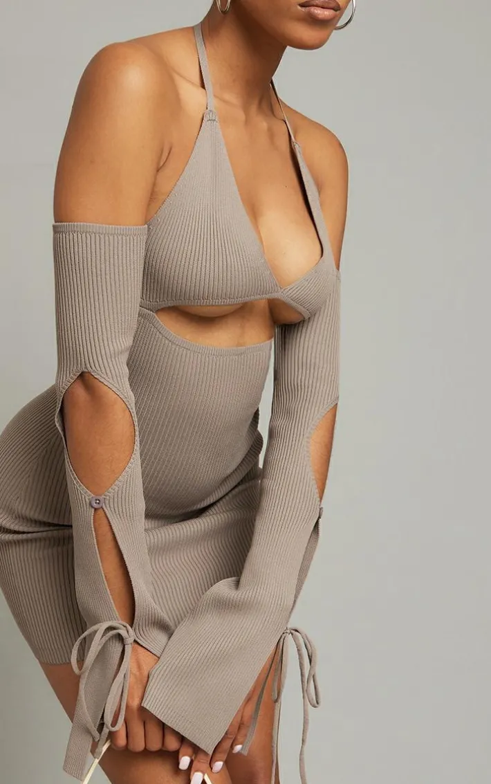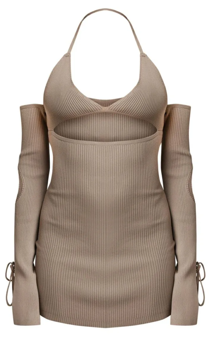 Get ready to have all eyes on your with this mocha flared cut out sleeves rib knit dress. This dress is brought to you in a mocha rib knit material with flared cut-out sleeves and a figure-flattering fit, how could you turn this down? Pair this knit dress with a cream shoulder bag and statement heels for a look that will turn heads for all the right reasons.