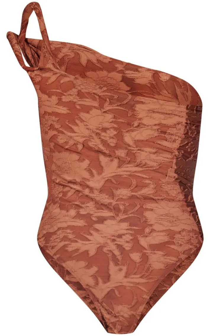 We’re totally in love with this mocha floral sheer burnout asymmetric twist detail strap bodysuit for your weekend plans. It is made from a mocha floral sheer burnout material with twist detail and a strappy design, how could you not be obsessed? This bodysuit gives you endless styling potential and is bound to give your look that extra chic touch. Style seamlessly with the matching mini skirt, clear heels and gold accessories for a seriously luxe finish.