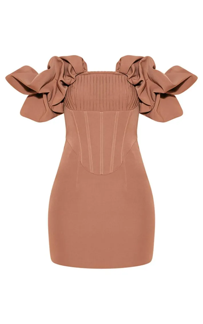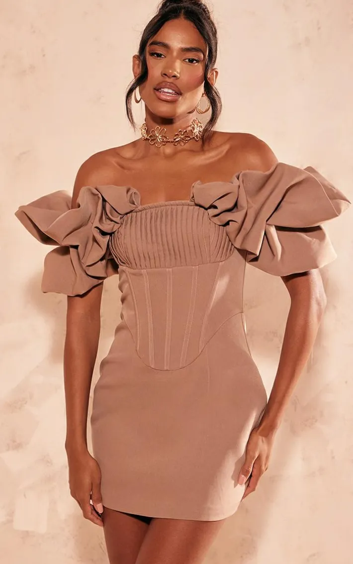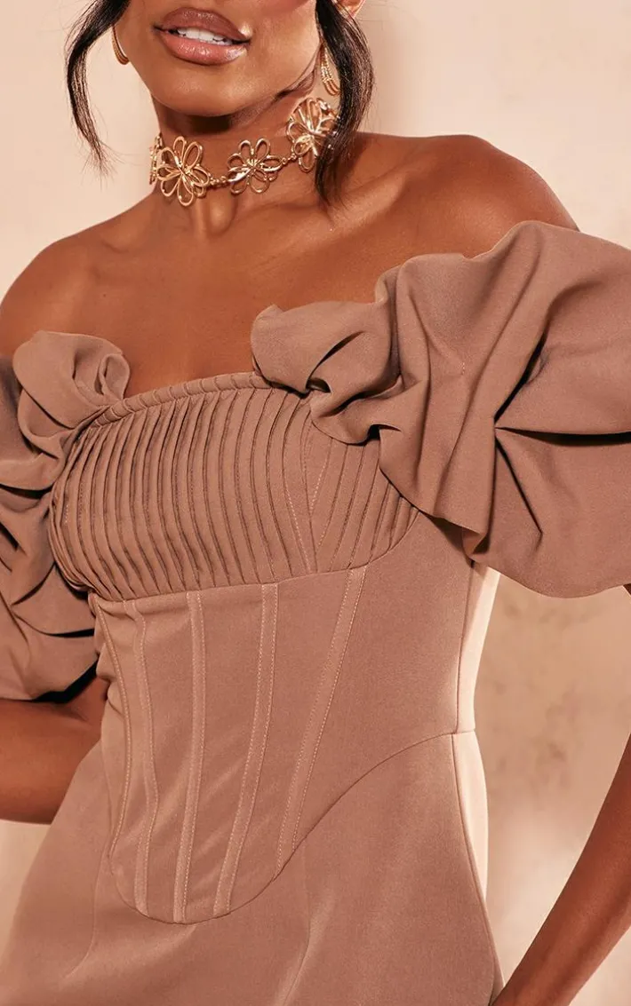 This mocha pleated corset detail puff sleeve bodycon dress is here to solve all of your weekend wardrobe dilemmas. Brought to you in a mocha hue material with a pleated corset design, puff sleeve detailing and a flattering bodycon fit, how can you say no? Style this bodycon dress with your highest heels and gold accessories for a look that will have eyes on you all night long.