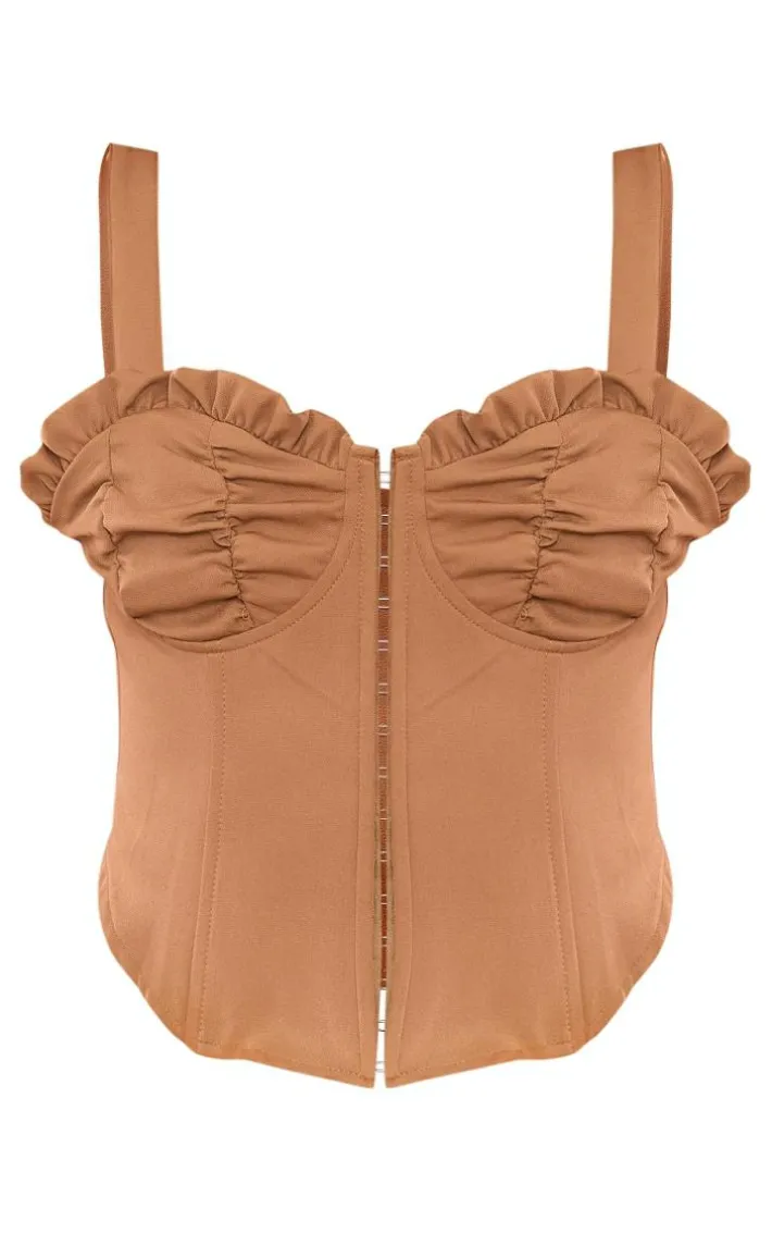 Take your new season look to a whole new level with this mocha ruched bust hook and eye corset. Brought to you in a mocha material with ruched detailing and a hook and eye design, how can you resist? Style this with faux leather bottoms and high heels for a look that is sure to make heads turn for all the right reasons.