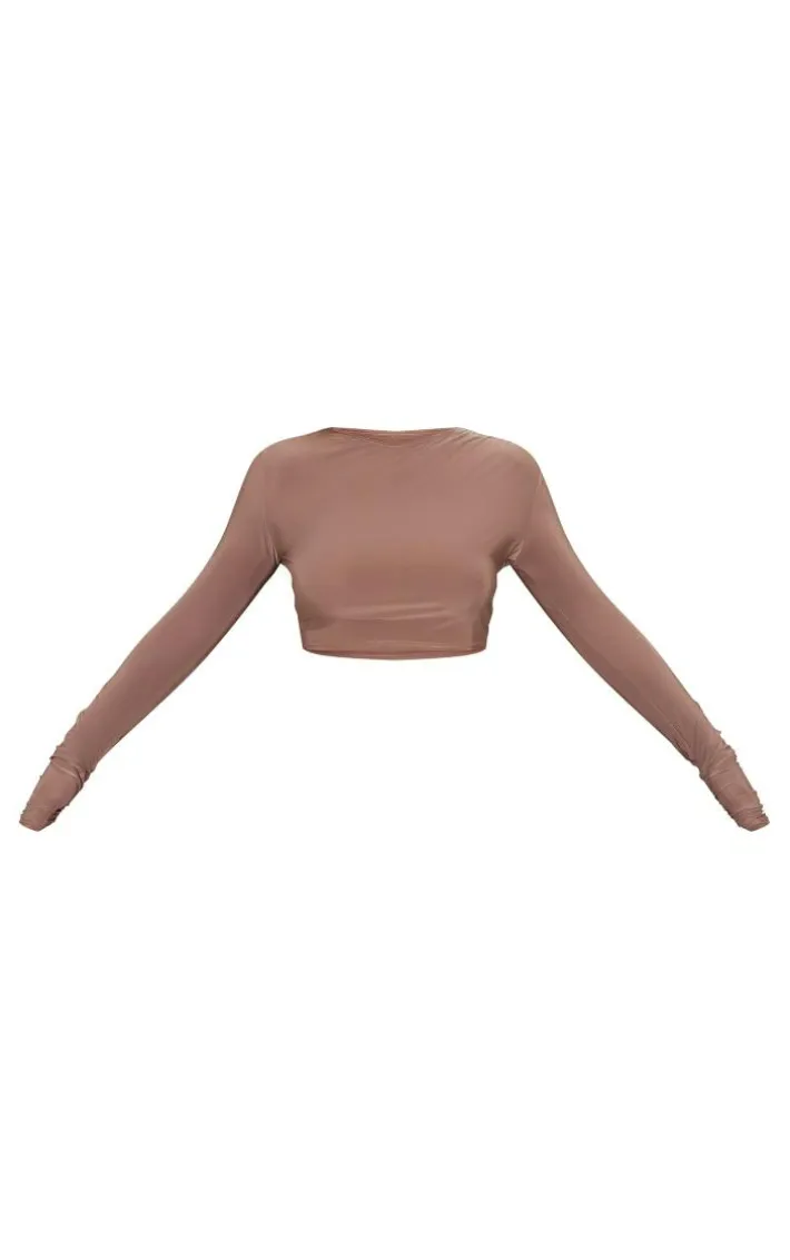 Inject some chic neutral hues into your weekend wardrobe with this mocha slinky long sleeve ruched detail crop top. Brought to you in a mocha hue slinky material with long sleeves, ruched detailing and a cropped fit, you really can’t go wrong. We are loving this crop top styled with the matching skirt, heeled boots and a clutch bag for a look that is sure to turn heads.