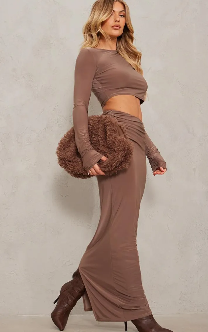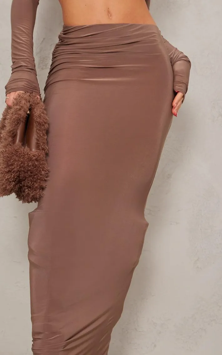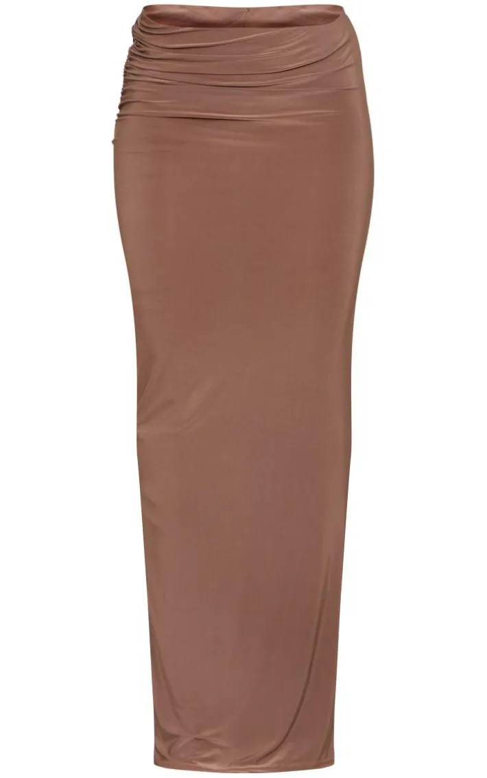 When the weekend calls, so does this mocha slinky low rise ruched detail maxi skirt. Brought to you in a mocha slinky material with a low rise design and a ruched detail, what’s not to love? Its maxi length is all you need to feel effortlessly chic. Team with some heeled boots and, the matching crop top and a statement bag to finish off the look.