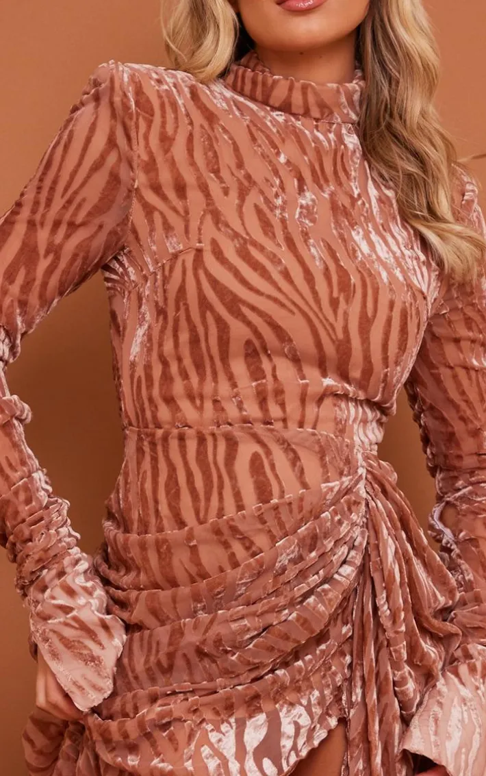 This dress is all you need to put together the ultimate outfit. Featuring a mocha hue zebra devore material with a high neckline, a draped design and a midi length, we are obsessed. All you need to complete the look are heels and accessories.