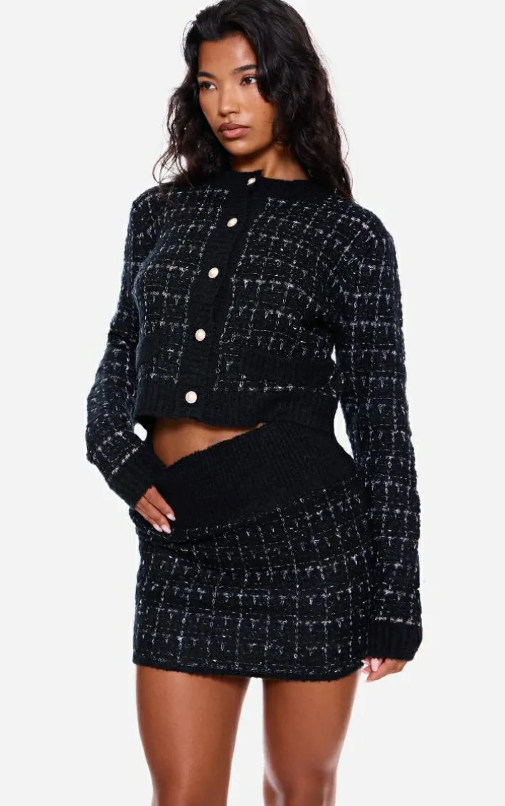 This monochrome contrast boucle knit mini skirt is bringing you all the luxe vibes needed for this season. With a classic monochrome shade, a contrast boucle knit material for ultimate comfort, and a mini skirt fit, how could you say no? For a look like no other, style with the matching cardigan and faux leather black shoes.