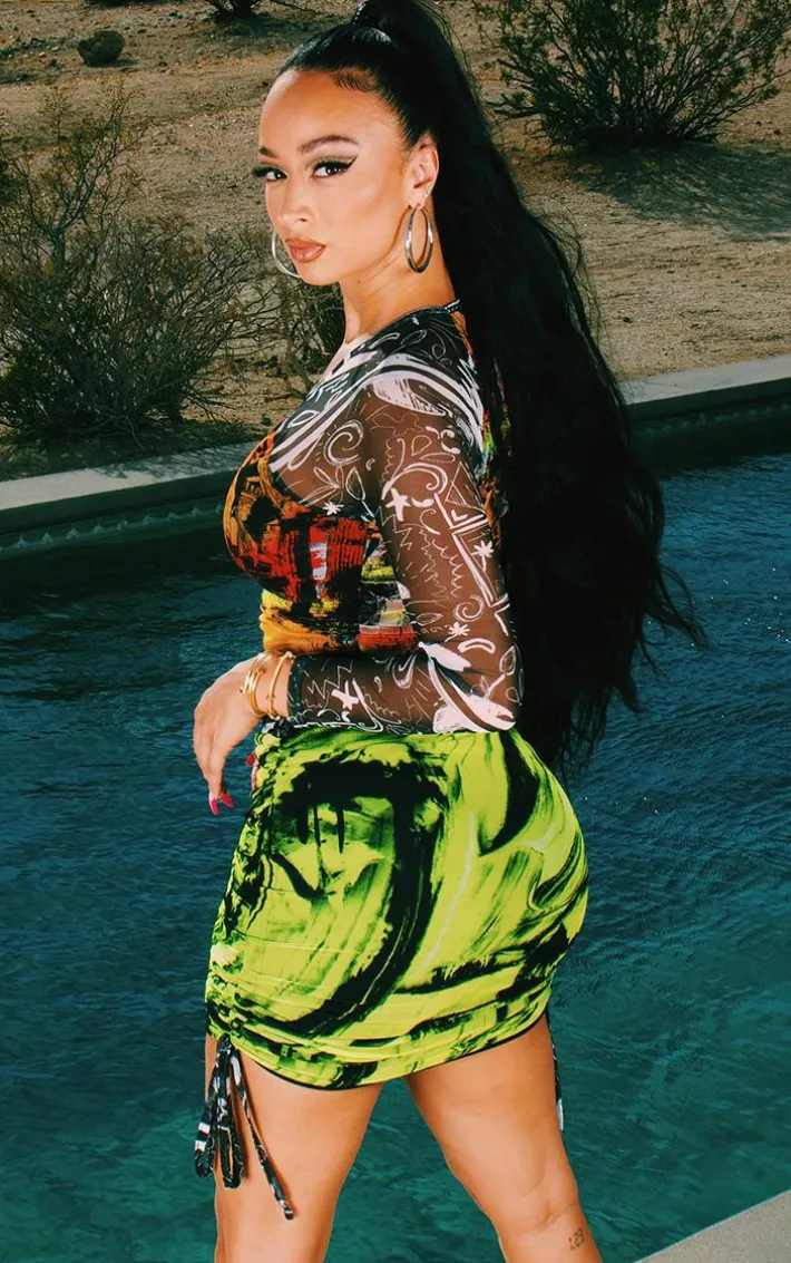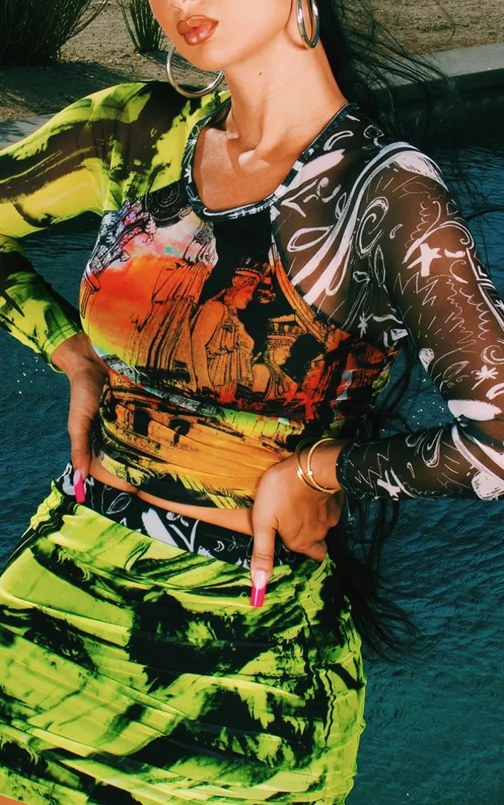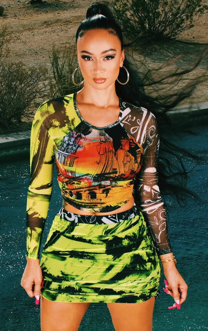 amp up your new seaosn look with this crop top. Featuring a multi abstract print mesh material with a ruched design and long sleeves, we are obsessed. Wear with the matching mini skirt and bright heels to elevate the look.