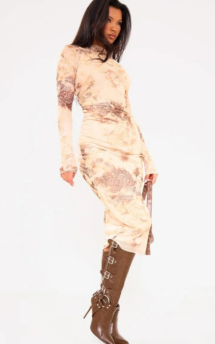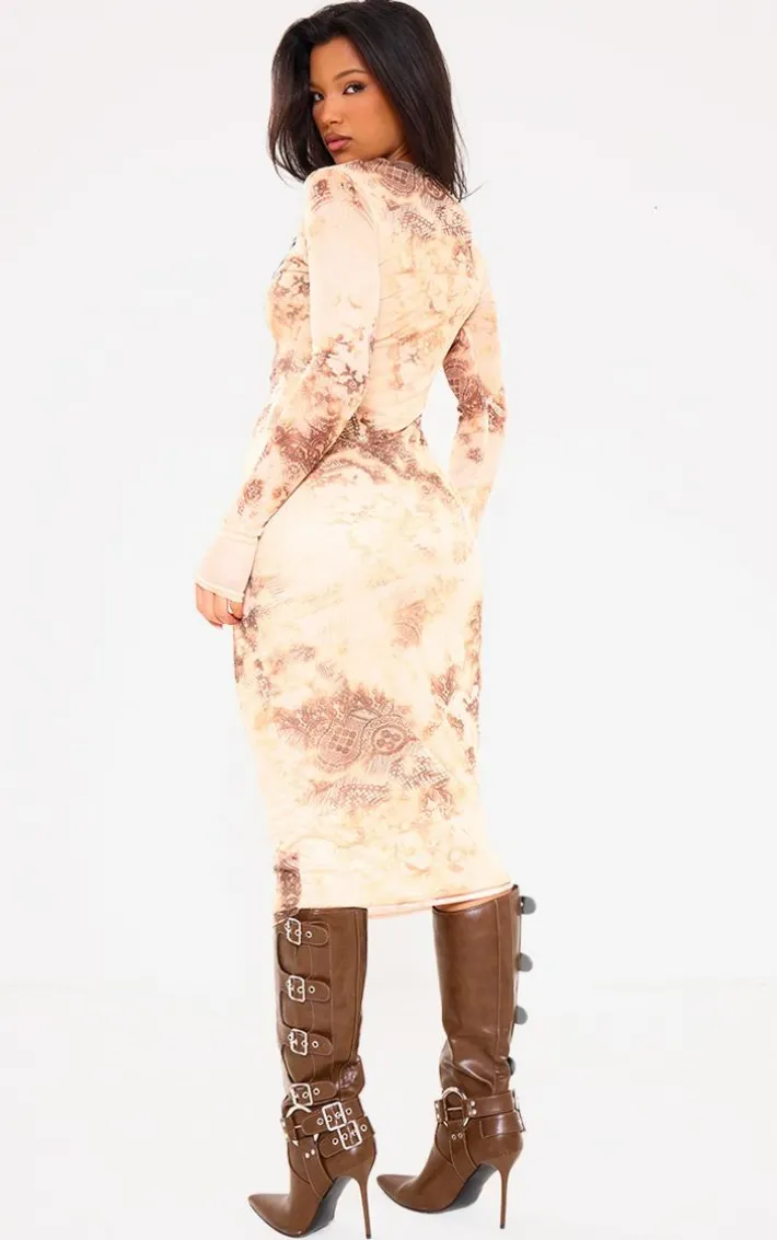 Get your glam on with this multi abstract ruched mesh long sleeve midi dress. Made from a multi abstract material with a ruched mesh style, long sleeves and a midi length, you’re sure to have all eyes on you. When the weekend calls so does this midi dress. So what are you waiting for? Shop the look and opt for knee-high boots and accessories. This midi dress will have you setting trends wherever you step foot.