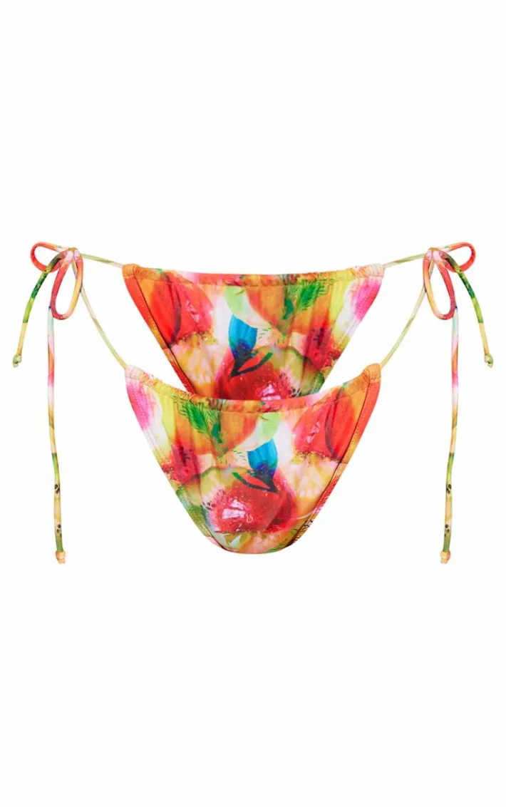 Get ready to add some bold hues into your vacay wardrobe with these multi blurred fruit print tie side bikini bottoms. Brought to you in a multi hue material with a blurred fruit print design and tie side fastenings, what more could you need? Style these printed bikini bottoms with the matching top and statement gold accessories for a poolside look that is sure to make heads turn.