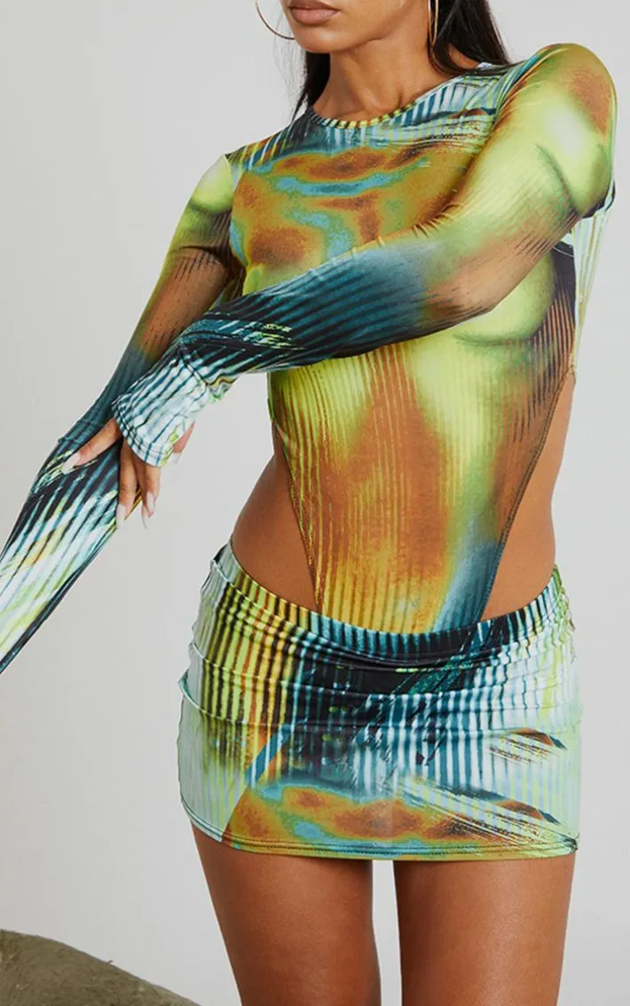 You are sure to get everyone talking with this eyecatching piece. Featuring a multi hue material with a low rise design, a mini micro length and a flattering fit, what’s not to love? Wear with the matching bodysuit to keep things coordinated this season.