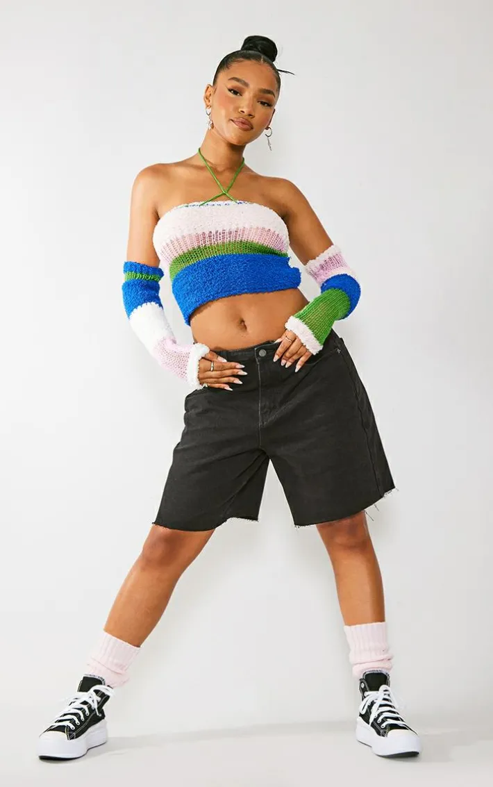 Take your off-duty wardrobe to a whole new level with this multi-contrast mixed knit bandeau top and sleeves. This top and sleeves is brought to you in a multi-contrast mixed knit material and are perfect for adding a touch of luxe to any look. The top also features a halter neckline and a figure-flattering fit which is sure to make you feel like your best self. Team with denim shorts, chunky sneakers, and gold accessories for a fresh finish that won’t be unnoticed.