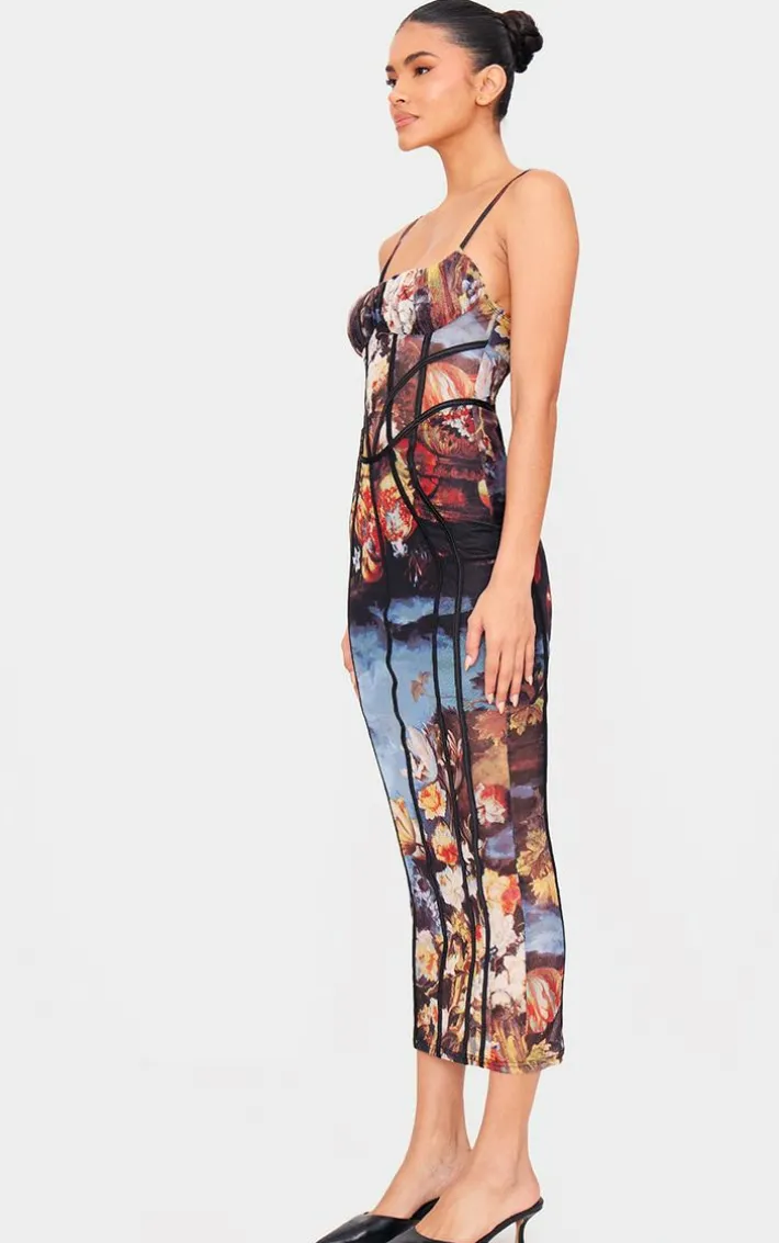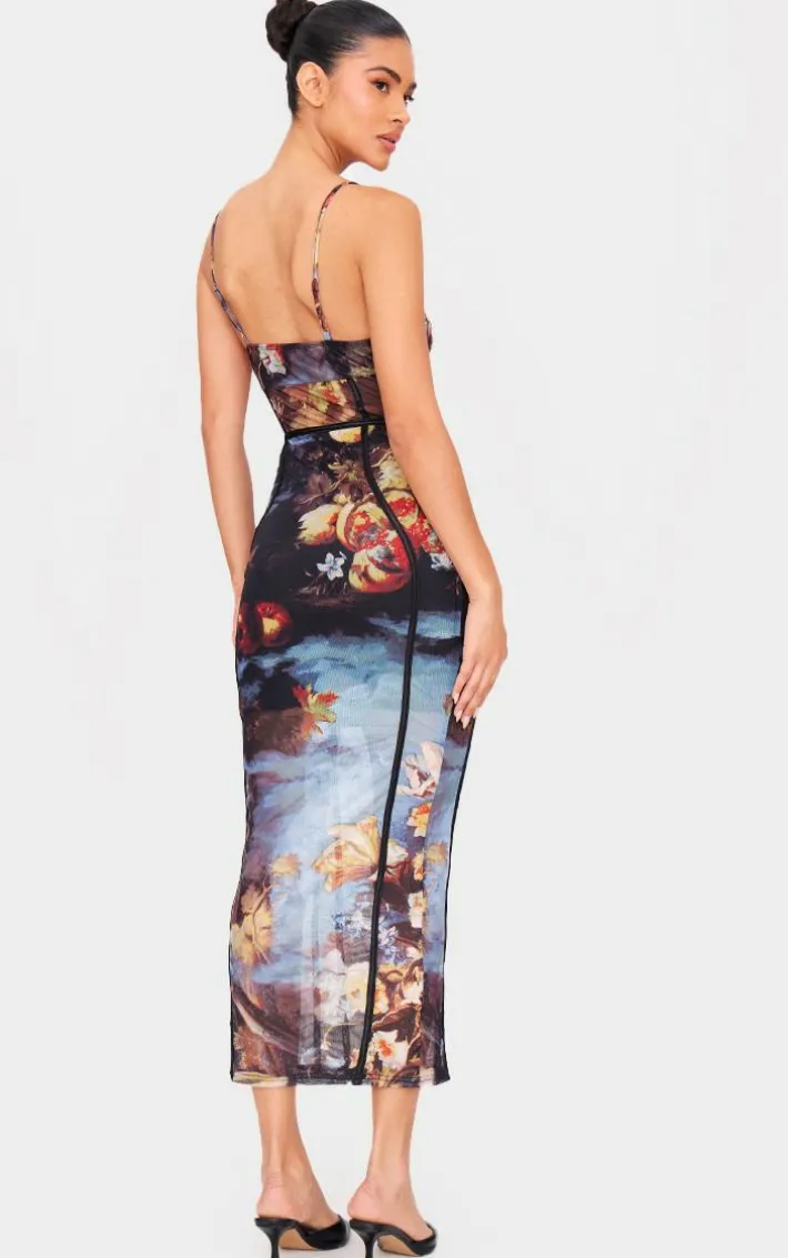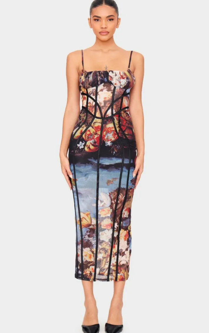 Step out in style with this multi floral print mesh binding detail midaxi dress. Brought to you in a mutli mesh material with a floral print design, it’s a definite yes from us. This dress has a midaxi length we just can’t get enough of. Pair with your go-to court heels and minimal accessories to finish off the look.