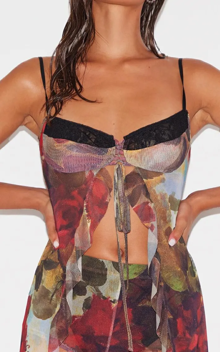 Bring all the drama to your weekend plans with this multi floral printed mesh ruffle tiered long bralet. Made from a multi hue mesh material with a floral print design, ruffle detailing and a longline style, how can you say no? Pair this mesh bralet effortlessly with the matching hotpans and knee length heeled boots for a weekend-worthy look to be remembered.