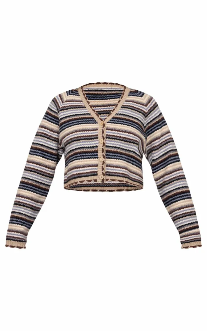 Your wardrobe needs this multi knit jacquard stripe cropped cardigan. Featuring a stripe knit pattern in neutral tones, v neck cut and button down front, it’s figure flattering and comfort goals. Take your look to the next level with a clutch bag, mini skirt and knee high boots, and you’ll be getting all the likes.