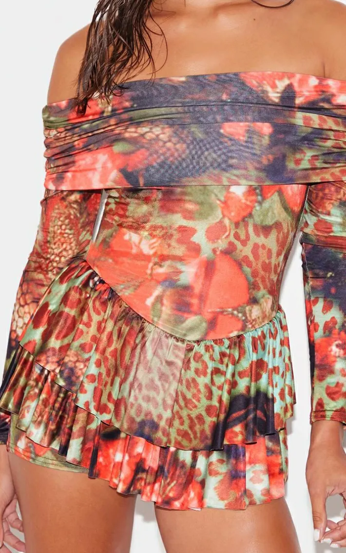 Look all kinds of chic in this multi leopard print slinky long sleeve bardot rara skort romper. Brought to you in a multi hue slinky material witha leopard print design, long sleeves and a bardot neckline, this rara skort romper is a must have for all your styling needs. Team with slip on heels and simple accessories for a look that won’t go unnoticed.