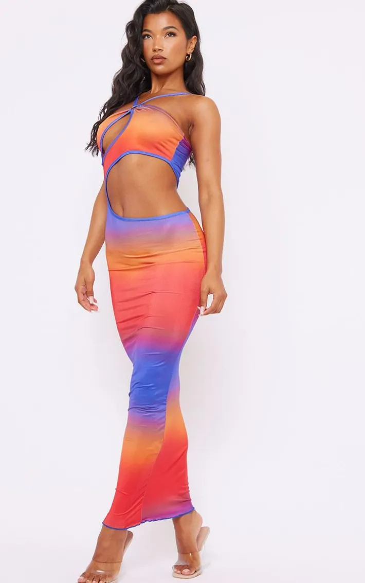 Take on your weekend the right way with this statement multi ombre print slinky ring detail cut out maxi dress. Made from a multi ombre print slinky material with ring detailing, a cut-out front and a maxi length, this is everything we’re loving and more. With It’s figure-hugging fit this women’s maxi dress is sure to hug you in all the right places. To complete the look style this seamlessly with your dreamy high heels and accessories for a look that will secure you all the likes.