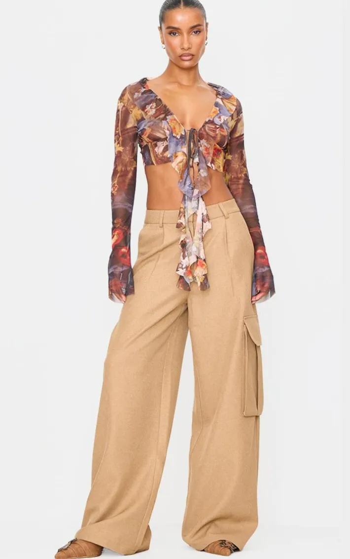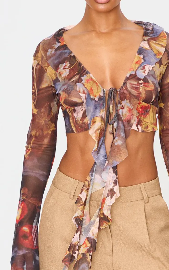 Make a statement whatever your weekend plans with this multi printed mesh ruffle long sleeve drape crop top. Brought to you in a must have mutli hue with a printed design, a luxe ruffle detail and draped feature, opt for this to stand out from the crowd. This top pairs perfectly with neutral wide leg pants and court heels for a chic finish.