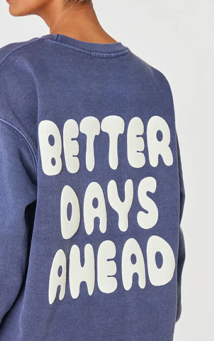 New sweats have landed with this navy better days ahead printed washed sweatshirt. Cosy season starts here. Brought to you in a navy hue sweat material with a ‘Better Days Ahead’ printed detail and washed design, this sweatshirt is a must have. Team with leggings, fresh kicks and your go to tote perfect for those chilled out days.