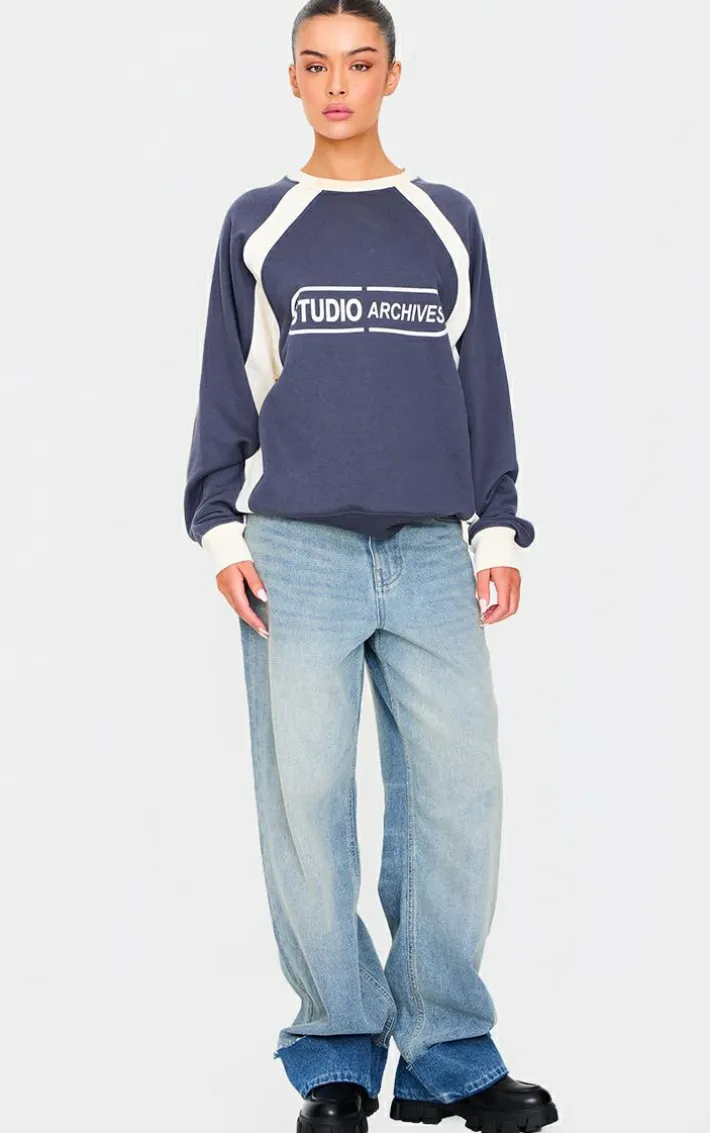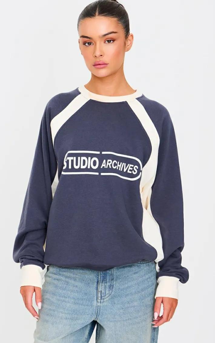 Keep it comfy with this navy contrast panel studio archives sweatshirt. Brought to you in a navy material with a contrast panel design and a ‘Studio Archives’ print, what mire could you want? This sweatshirt is all you need to be on trend. Style with a pair of jeans and some chunky loafers for a look we are loving.