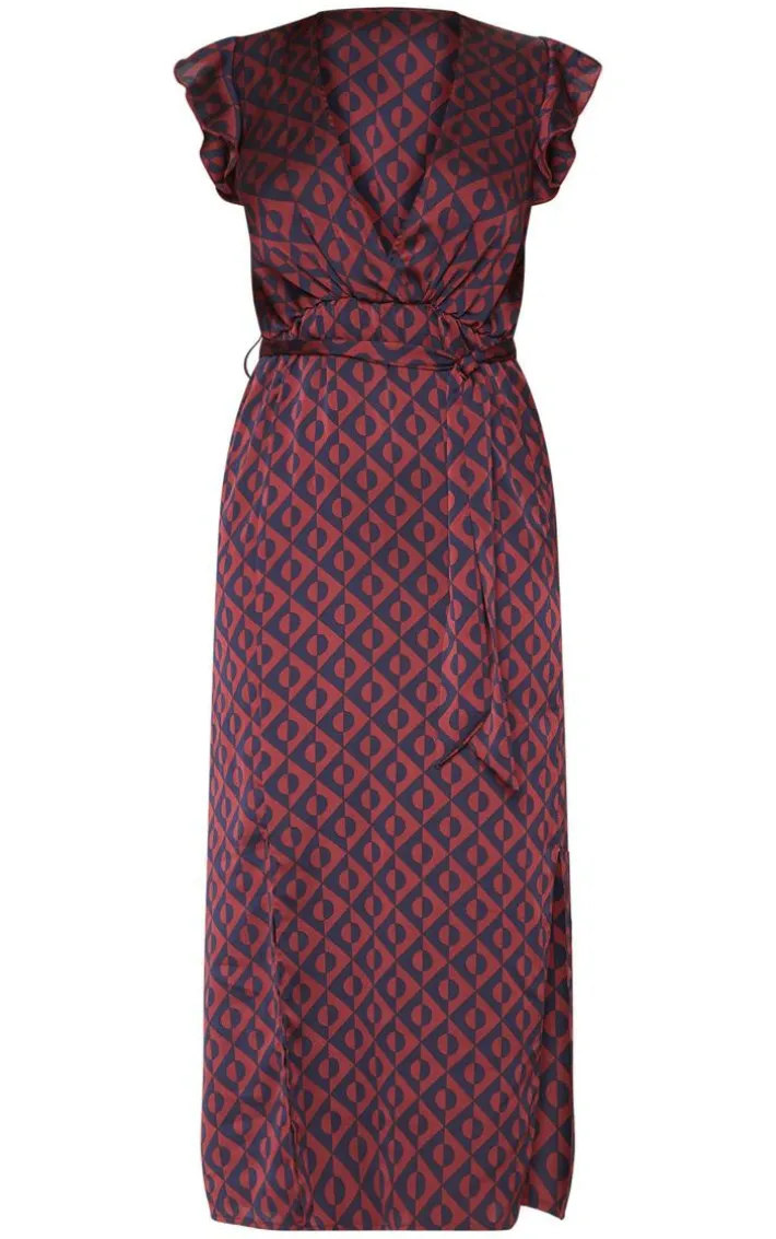 This dress is a staple for your holiday wardrobe. Featuring a geo print lightweight fabric, frill shoulders and split hems, style it with some nude heels for a cute daytime look.