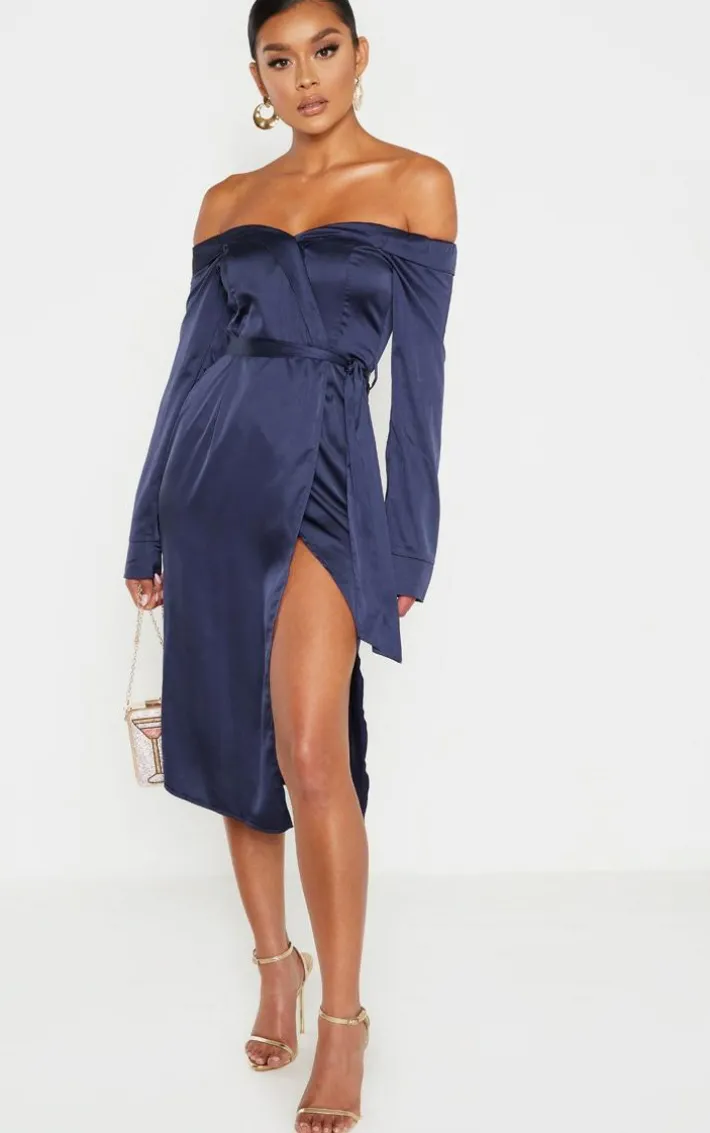 This satin dress is our new special occasion saviour, style it up for all those special occasions you’ve got planned. Featuring a navy satin material with long sleeves, a wrap design and a bardot neckline, we are so obsessed. A wrap midi dress is a seriously versatile style that will have your figure hugged in all the right places , you won’t be able to resist. Team it with some strappy heels and a mini bag for a look that will get you noticed.