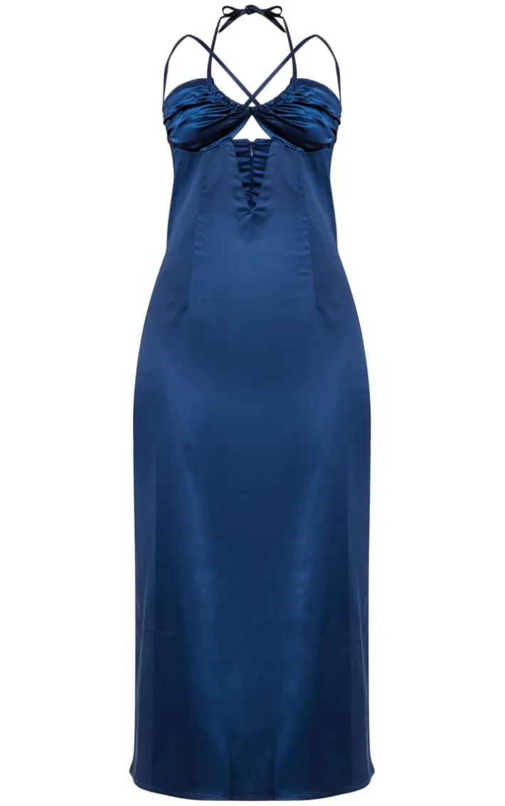 Got a special occasion coming up ? Then this navy satin halter neck midi dress is here to solve all your styling dilemmas. It is made using a navy satin material with a halterneck style and a midi length, what more could you ask for? Just add clear slip-on heels and your fave accessories for a luxe finish.