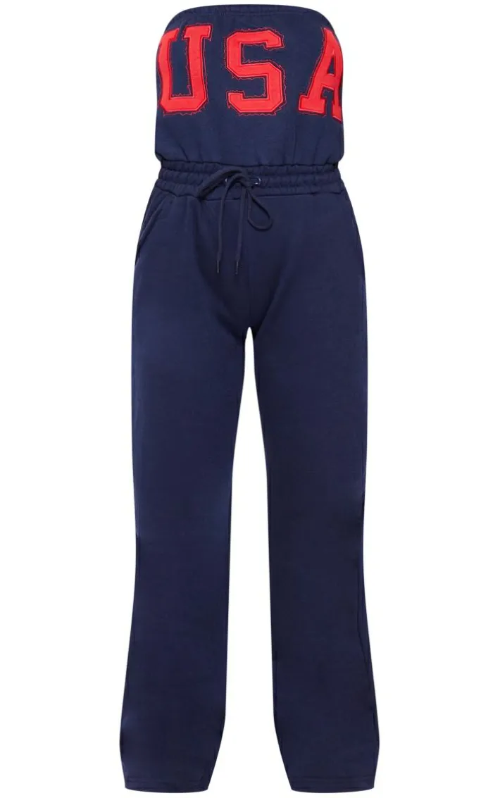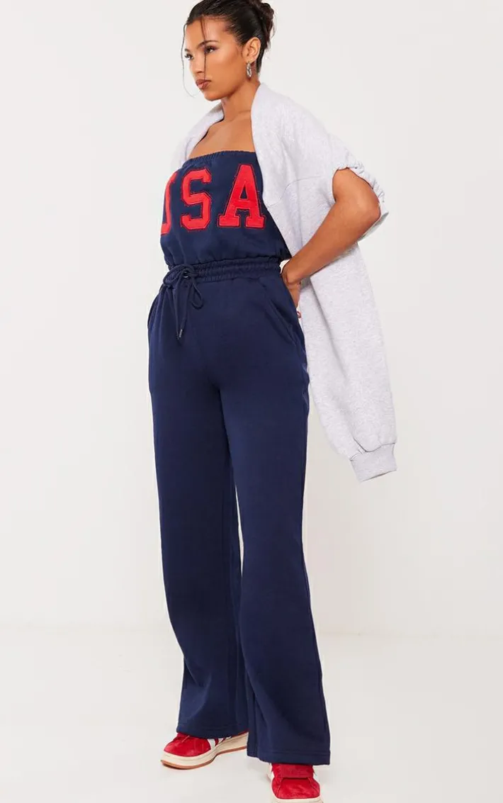 Your off-duty look is calling out for this navy USA graphic tie bandeau wide leg jumpsuit. Brought to you in a navy material with a ‘USA’ graphic across the front, we are obsessed. This wide leg jumpsuit has a bandeau fit and a tie detail, it’s a definite yes from us. Style with a pair of sneakers and your fave sweater for a seriously chilled look.