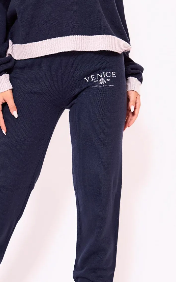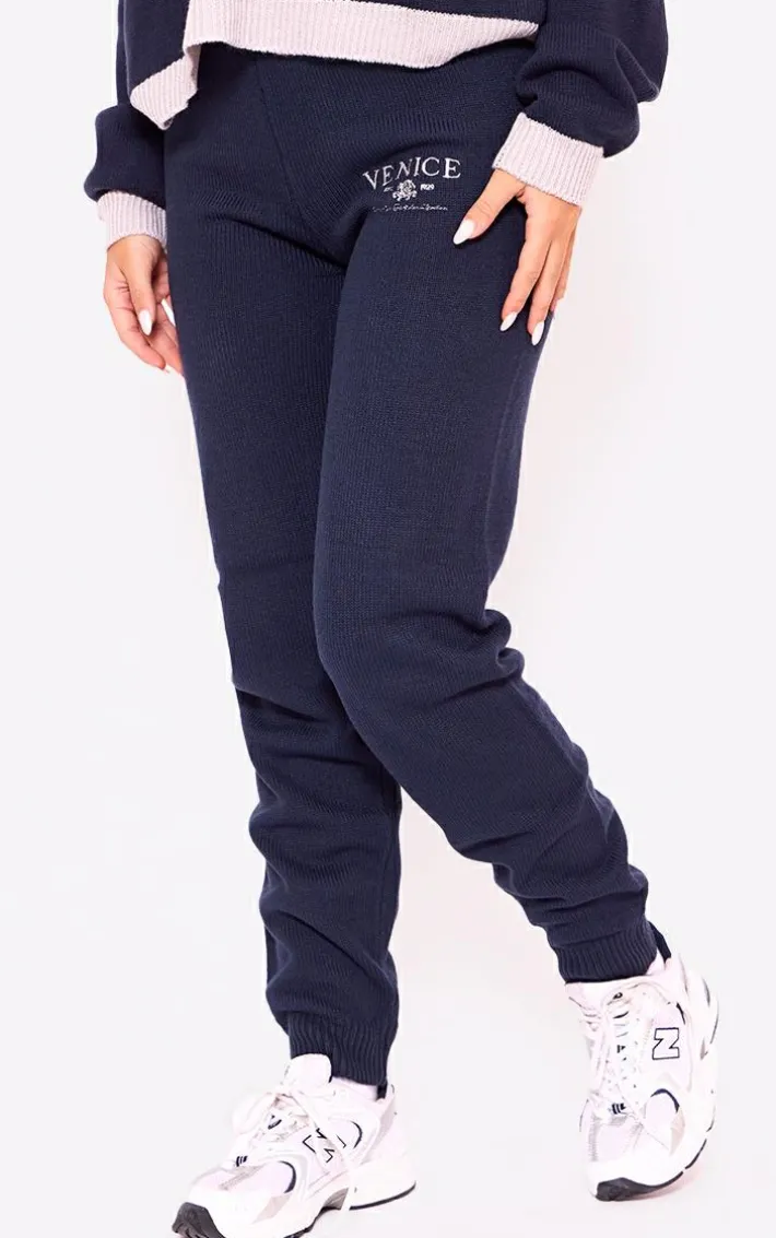Level up your off-duty wardrobe with these navy Venice embroidered knitted sweatpants. Brought to you in a navy knitted material with a ‘Venice’ embroidered design and a comfy fit, how could you say no? Whether it’s a chilled day at home or you’re running your everyday errands these sweatpants are the one for you. Level up the look and add the matching hoodie, a white cap, box-fresh kicks and your everyday essentials for the ultimate combo..