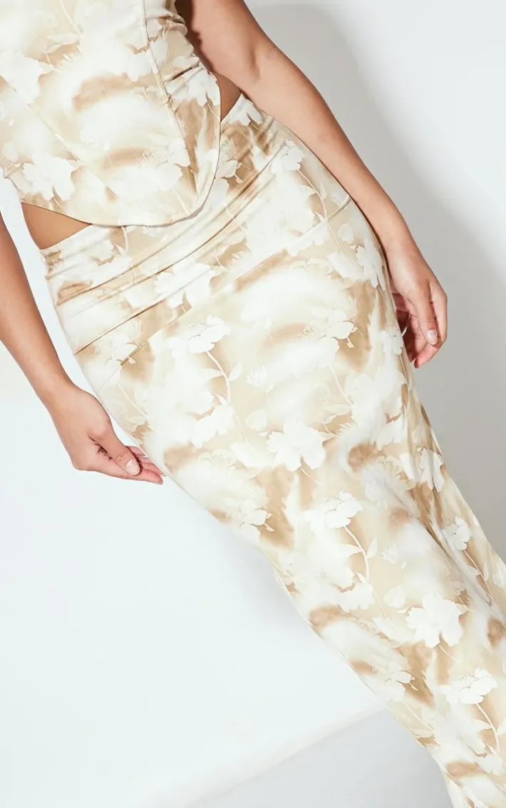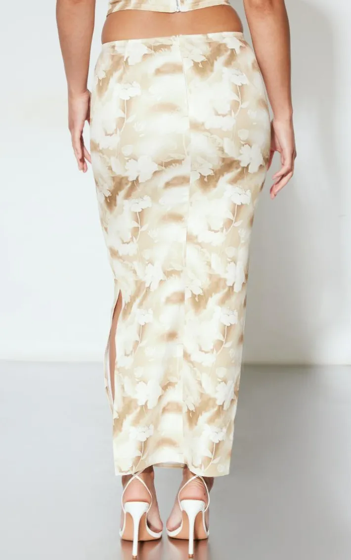 Step out in style this weekend with this nude abstract print woven low-rise midaxi skirt. Its nude abstract print woven material adds all the luxe vibes to your look whilst its low-rise waist and split hem shows off your unreal figure. No matter what your plans are this weekend, this midaxi skirt is a definite must-have. Style effortlessly with the matching corset top, strappy heels, a shoulder bag and gold hoop earrings for a super dreamy look.