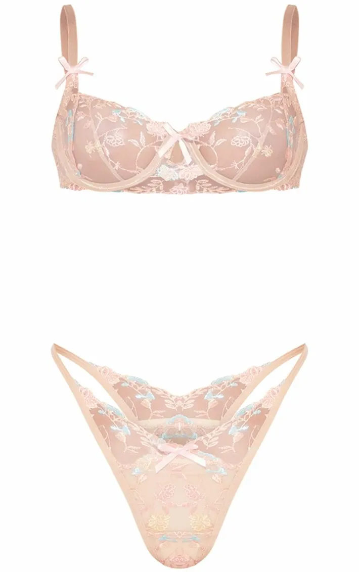 Take your lingerie look to new heights with this nude floral lace mesh underwired bra and thong lingerie set. This lingerie set includes an underwired bra and matching thong in a nude hue mesh material with a luxe floral lace design, what more could you ask for? Style this bra and thong set with gold accessories for a look they won’t be able to take their eyes off.