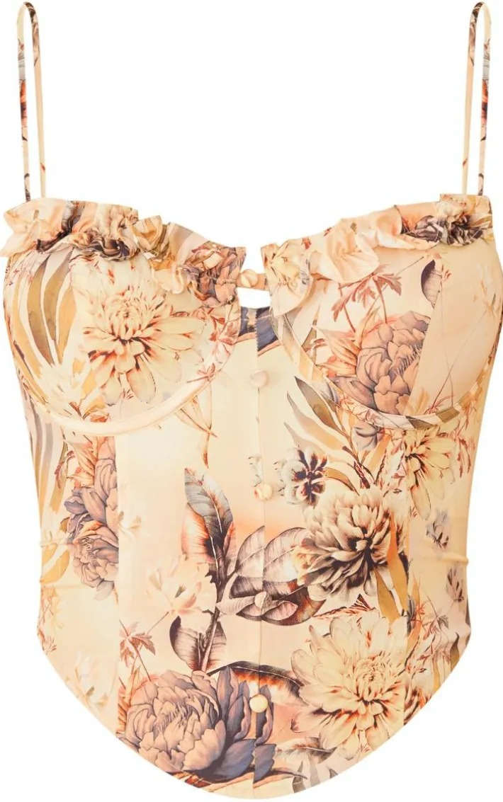 Add some seriously chic vibes to your new season wardrobe with this nude floral print ruffle trim corset. It is a must-have for your weekend plans and beyond. With a nude floral print material, a ruffle trim design and a zip fastening, you’re sure to be obsessed. Pair this dreamy corset top with the matching skirt, clear strap heels and your fave hoop earrings for a flawless finish.